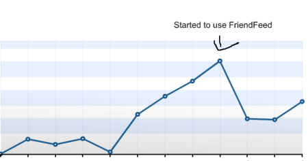 The start of this post (see the image above) may be a good reason for many people for not to join FriendFeed 🙂 . It shows what happened to number of visitors to this blog after I joined FF – it had dropped by half (actual numbers aren’t relevant, graph shows monthly statistics). The reason is pretty obvious for any long-time blogger – no posts, no visitors. I don’t post as often as before for a good reason – sharing news, interesting links and the whole conversation around these happens on the FriendFeed. While I didn’t set up a dream system I wanted to (see my comment on previous post on the FF), I don’t have any issues with so-called “information overload“. Actually, I don’t believe in any information overload – we are just pretty bad at managing incoming information – but that’s a story for another post.
